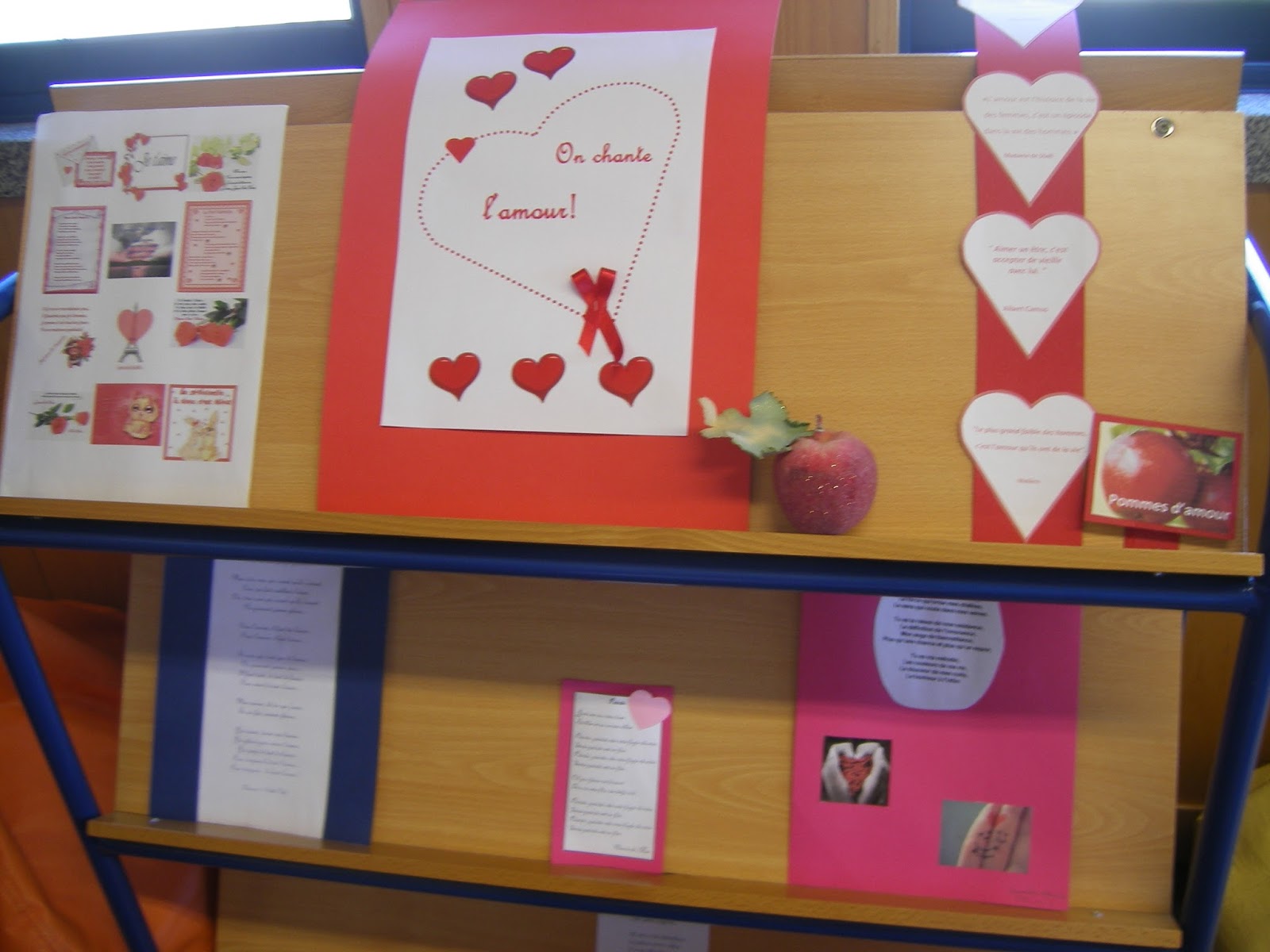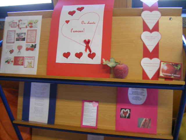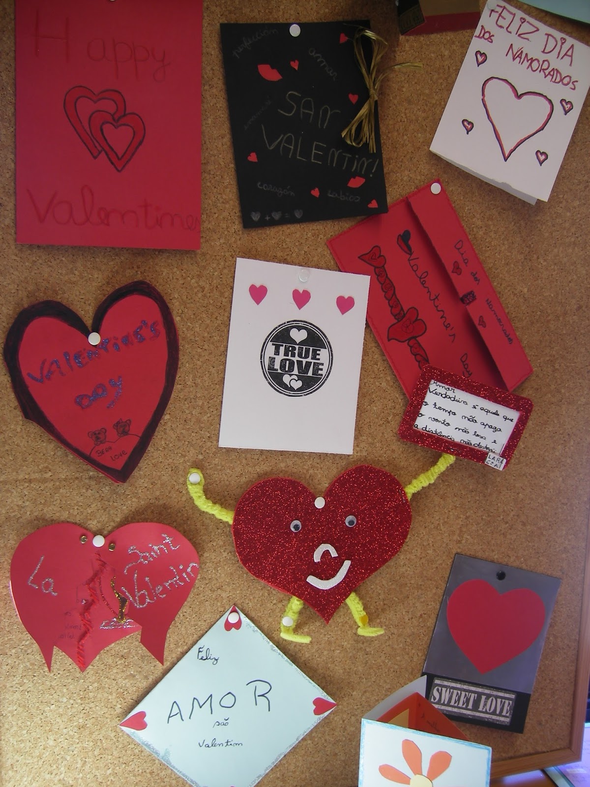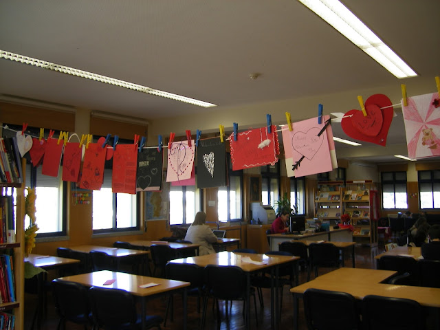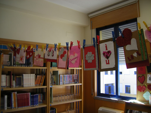 A nossa biblioteca está linda: há postais de São Valentim espalhados, afixados, até num estendal!